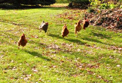 We've had day after day of gloomy grey skies and dreary rain. For about 5 minutes today, the sun peeked through the dark, heavy skies, creating a cheerful glow. I grabbed my camera as an excuse to be outside. As always, I was greeted by my little flock. They are truly a little flock now as we lost 4 over the summer to raccoons and hawks. They are very, very careful now, except when they see me. They race to see if I have a treat for them, be it a snack from the kitchen or worms from digging in the garden. If I don't, they'll visit for a few minutes before wandering off back to their daily chores.
