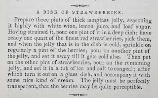I put a layer of this gelatin mixture into the pudding mould and set it into the fridge to partially set. The fridge is much more convenient that ice and salt. When the gelatin was very thick but not firm, I added a layer of cleaned an trimmed strawberries by pushing them into the gelatin. Back into the fridge it went until firm. The gelatin has to be firm enough to hold the first layer of strawberries as otherwise when you add the next layer of gelatin, the warmer gelatin will melt enough of the lower layer that the strawberries will float to the top. It was a little dismaying when I saw all those strawberries floating happily after I'd though they were set. Once the second layer is almost set, add more berries and continue until the mould is filled.